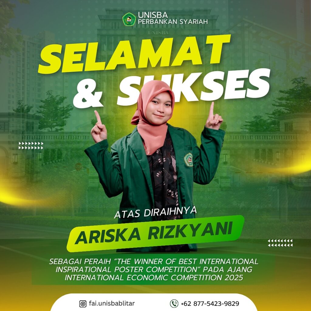 FAI – Blitar, 28 Agustus 2025 prestasi membanggakan kembali ditorehkan oleh mahasiswa Universitas Islam Balitar (UNISBA) Blitar. Kali ini, kabar baik datang dari Program Studi Perbankan Syariah, Fakultas Agama Islam. Salah satu mahasiswinya, Ariska Rizkyani, berhasil meraih penghargaan sebagai “The Winner of Best International Inspirational Poster Competition” pada ajang International Economic Competition 2025.