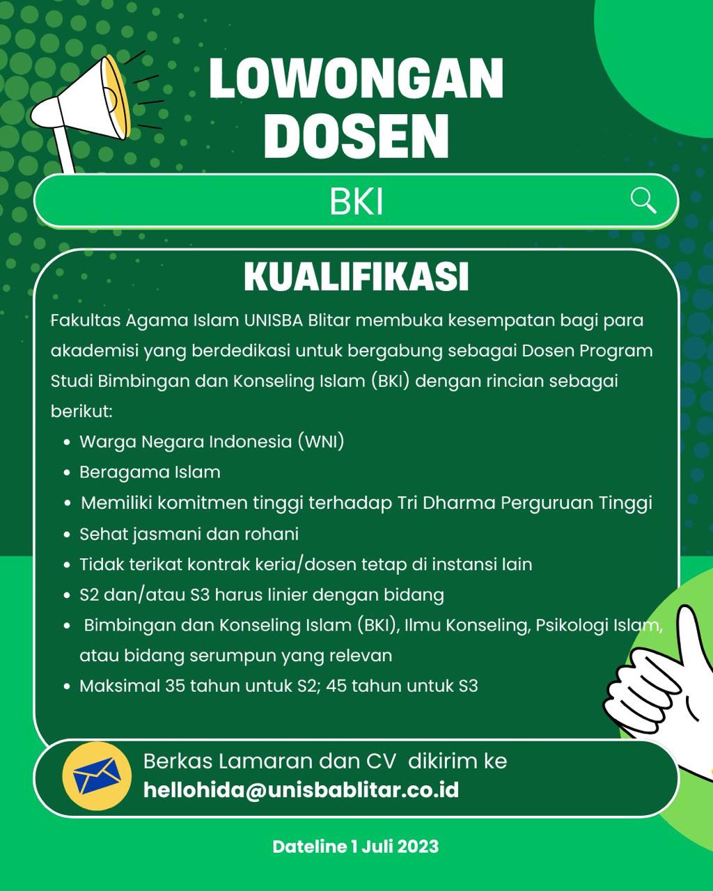 Fakultas Agama Islam Universitas Islam Balitar membuka kesempatan karier sebagai dosen program studi Bimbingan Konseling Islam dengan kualifikasi sebagai berikut: